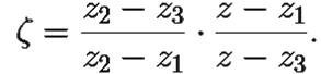 Поскольку проще всего вычислять коэффициенты дробно-линейной функции, если какие-либо из точек равны 0 и ∞, рассмотрим вспомогательные отображения z и