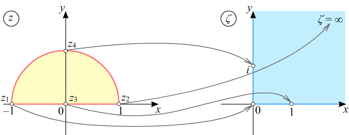 При этом мы получим, что исходный двуугольник отобразился в угол с вершиной в точке 0, одна сторона которого лежит на положительной действительной полуоси. Величина этого угла, в силу конформности отображения, равна