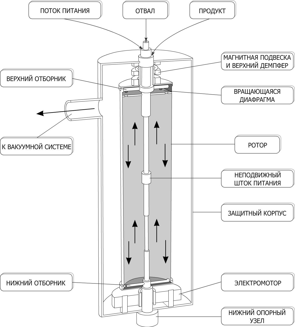 Степень разделения пропорциональна квадрату отношения скорости вращения к скорости молекул в газе. Типичные линейные скорости вращающихся роторов — 250–350 м/с, в усовершенствованных центрифугах — до 600 м/с. Максимальная теоретическая разделительная мощность центрифуги определяется известной формулой Дирака: